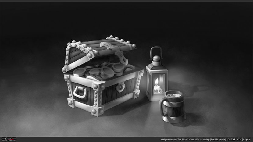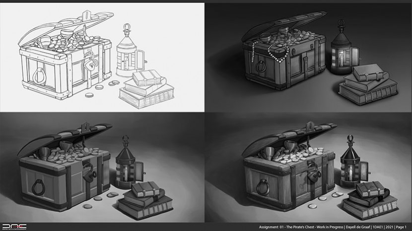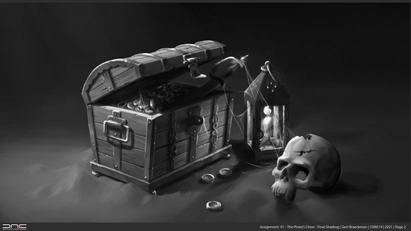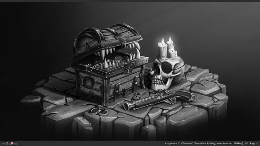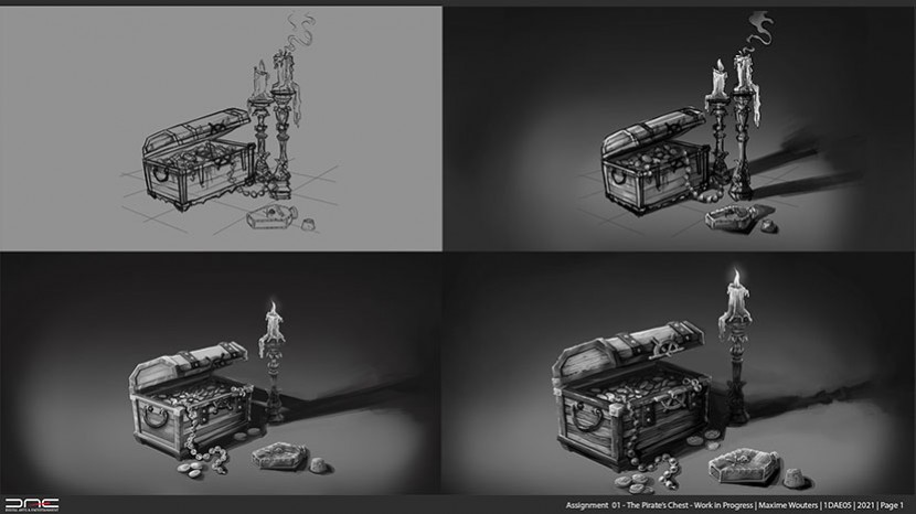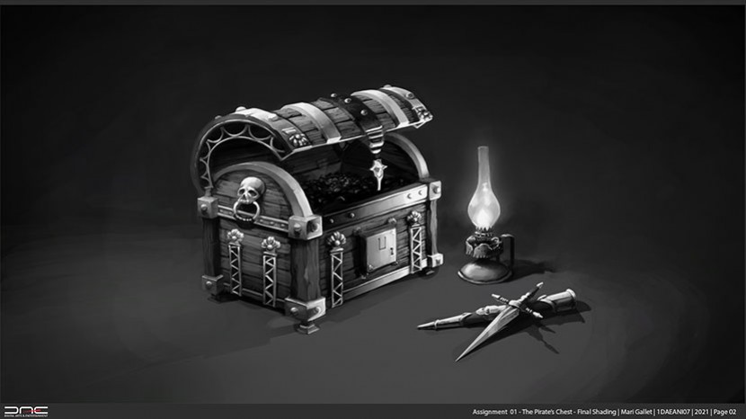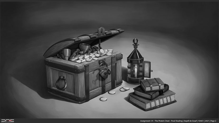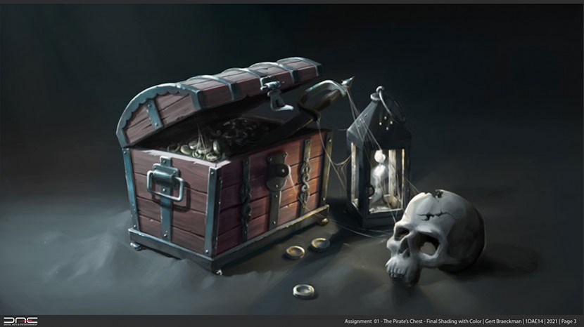 For this assignment the Game Graphics and 3D Animation students created a digital painting of a Pirate Chest based on a given perspective grid. The focus was on creating readable renderings through the use local values, matte and glossy surfaces and the principles of light.