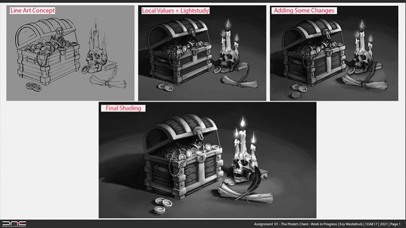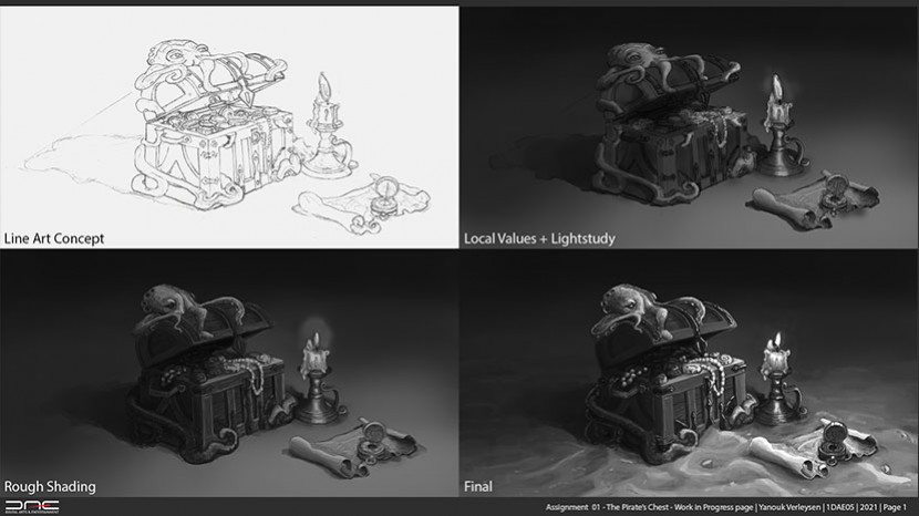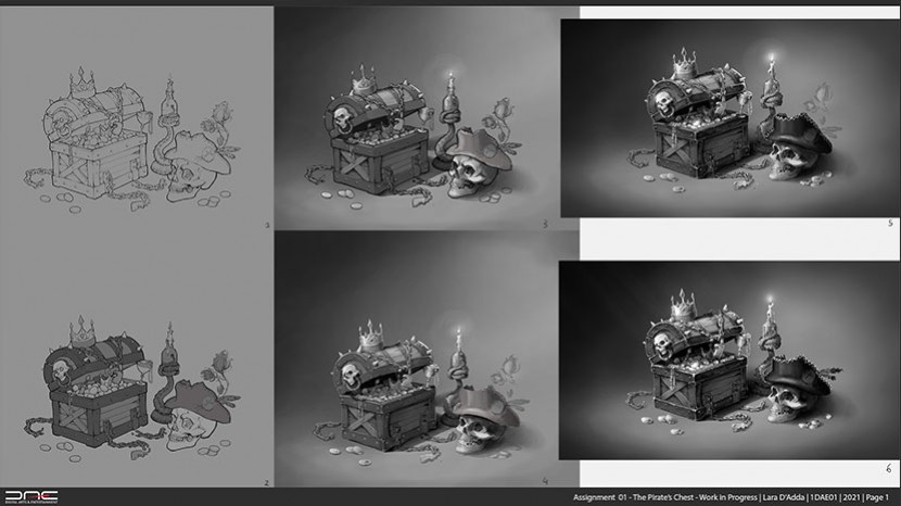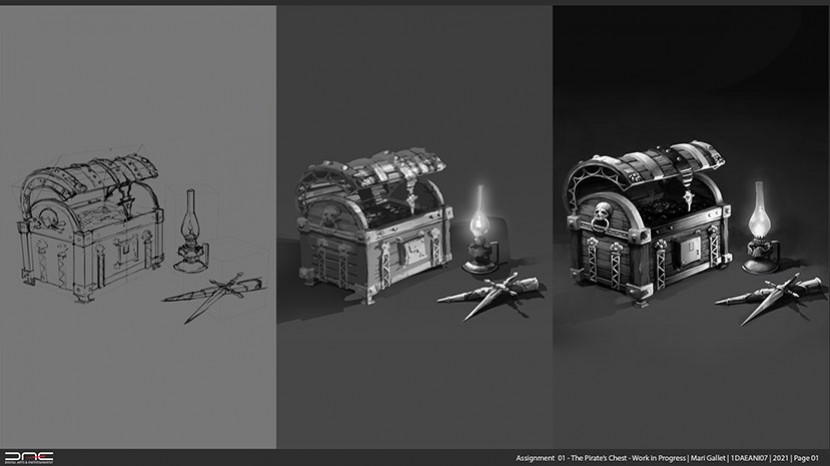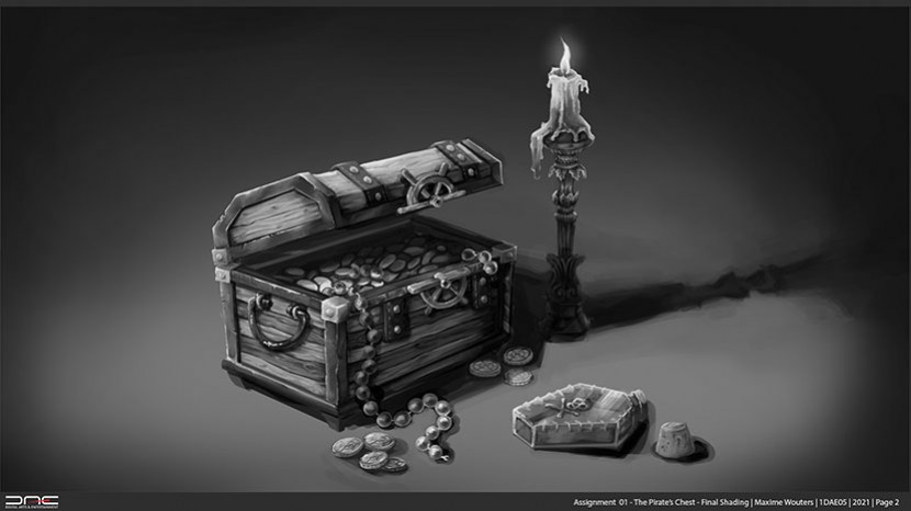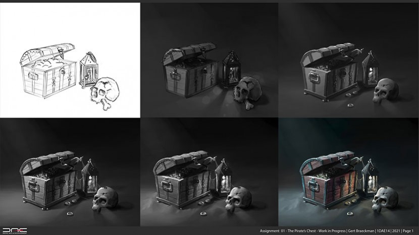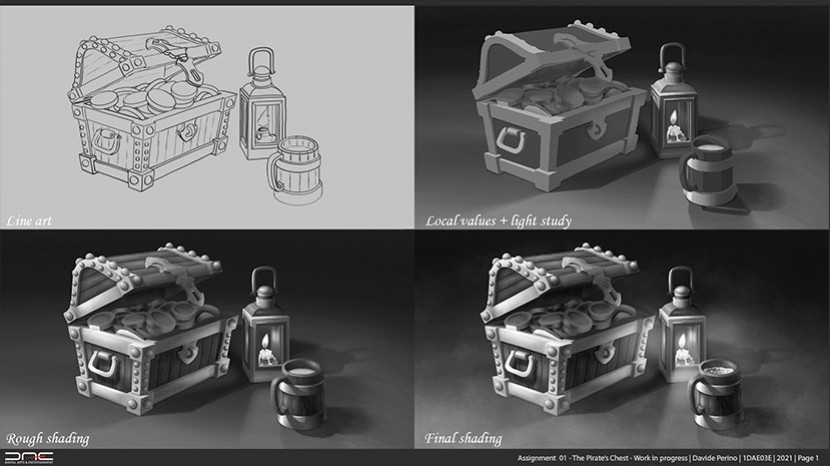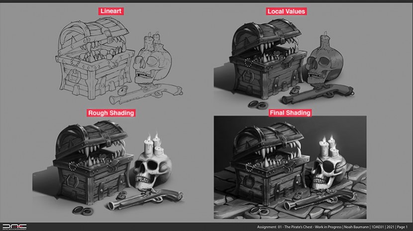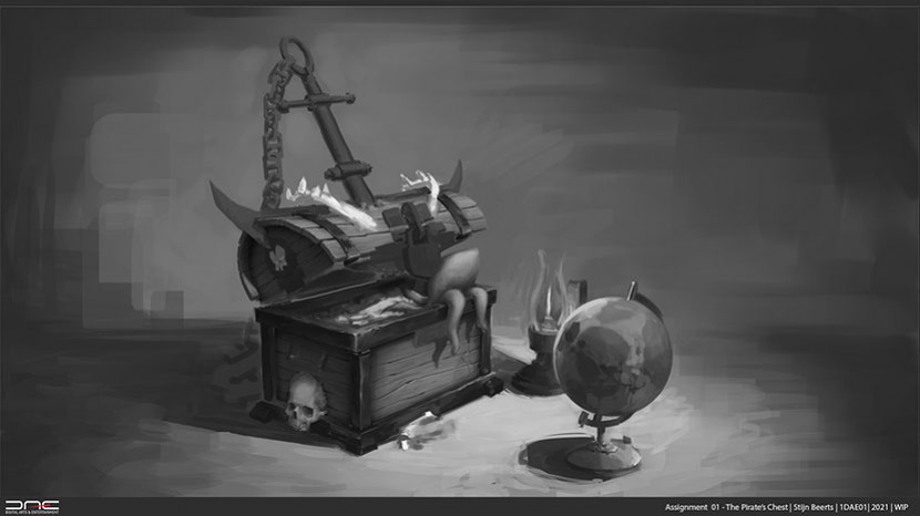 For this assignment the Game Graphics and 3D Animation students created a digital painting of a Pirate Chest based on a given perspective grid. The focus was on creating readable renderings through the use local values, matte and glossy surfaces and the principles of light.